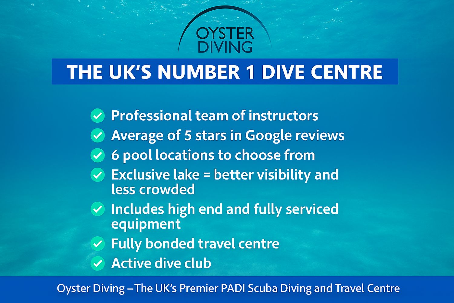 Oyster Diving are a multi-award winning 5-star PADI dive school and the UK’s premier PADI scuba diving and travel centre.