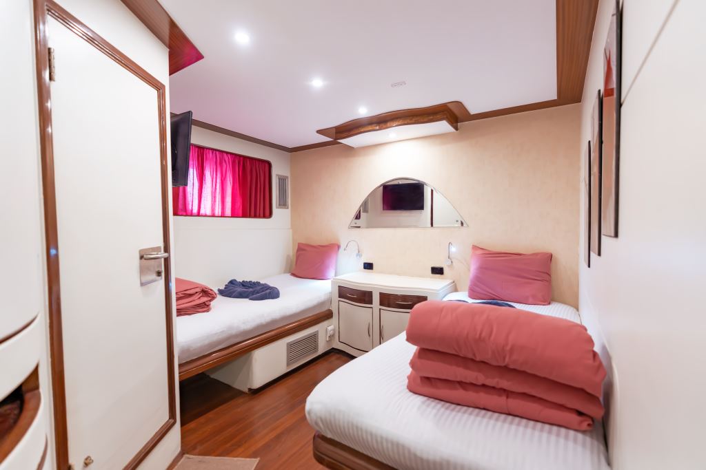 Sleeping up to 24 guests in 12 spacious staterooms that include 8 deluxe cabins that have twin beds, 2 double cabins with a queen bed, and 2 master suites with queen beds.