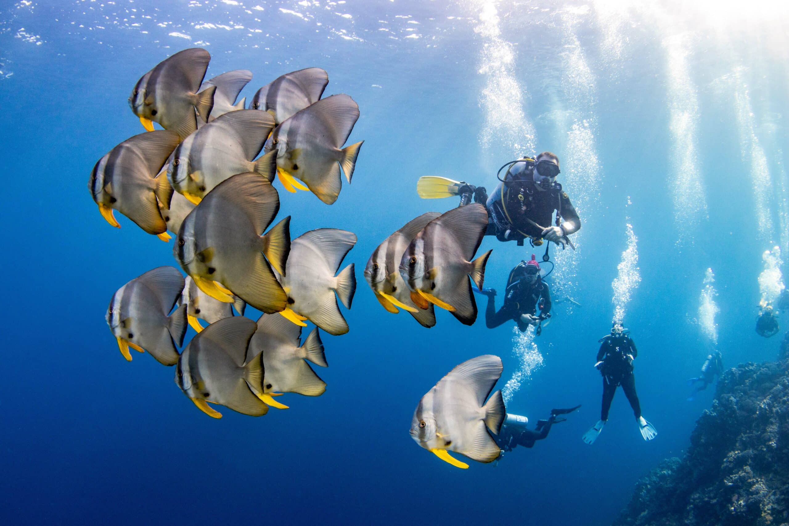 The Saudi Red Sea offers a unique blend of vibrant coral reefs, dramatic walls, and diverse marine life. Dive sites are rich with hard and soft corals, schooling fish, and a variety of pelagic species including tuna, barracuda, eagle rays, and several types of sharks—such as hammerheads and reef sharks. With crystal-clear visibility and healthy reef systems untouched by mass tourism, this is a rare opportunity to dive in truly virgin waters.