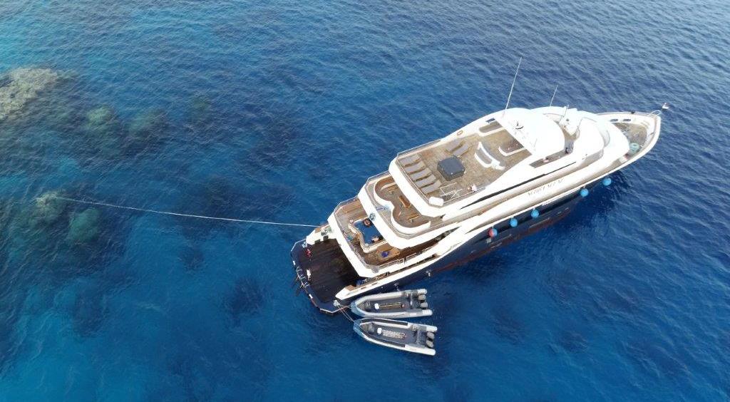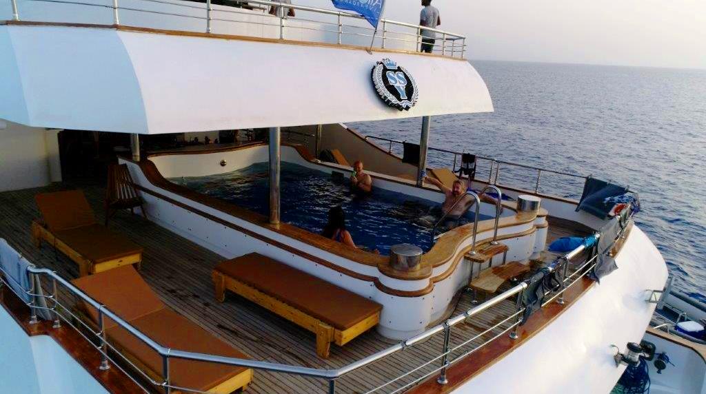 She is spacious, comfortable, and beautifully laid out, with a maximum capacity for 28 diving guests. Two large speedboats fitted with tank racks and dive ladders make life easier for divers – no more being hauled into a rib and face-planting on the dive gear. With no bedrooms on the lower deck, it means engine noise won’t spoil your sleep!- Swimming pool