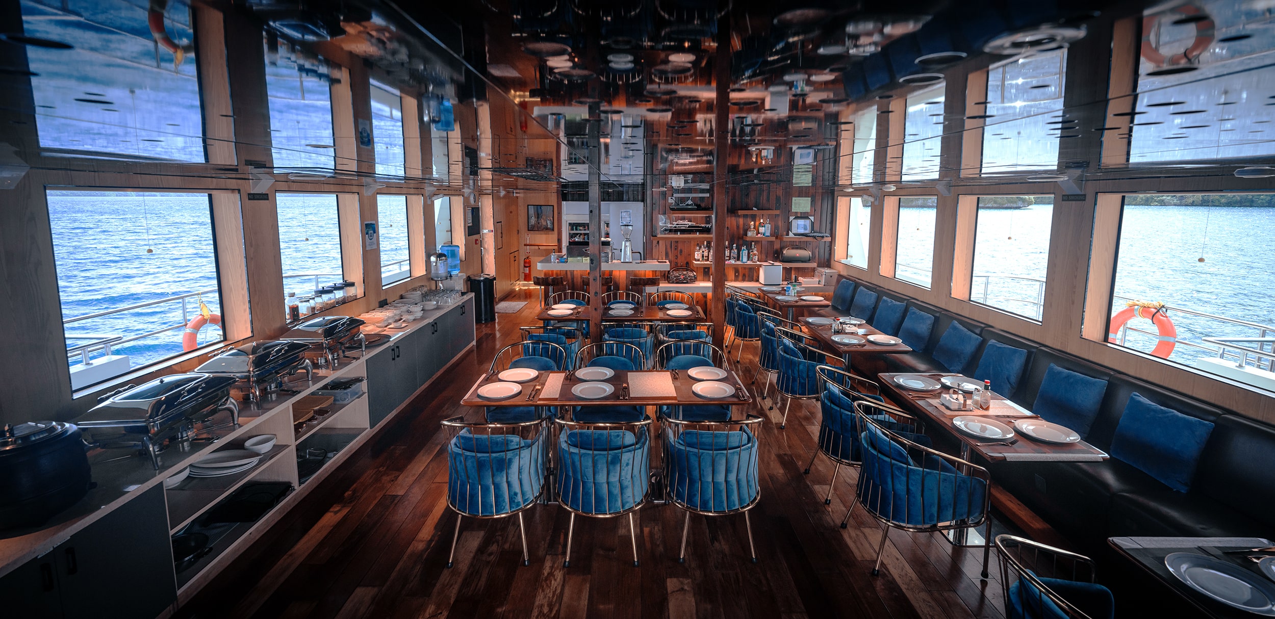 Accommodation consists of ensuite and twin-shared cabins, each equipped with essential room amenities. The sun deck enhances the outdoor experience with additional seating and sun beds.
