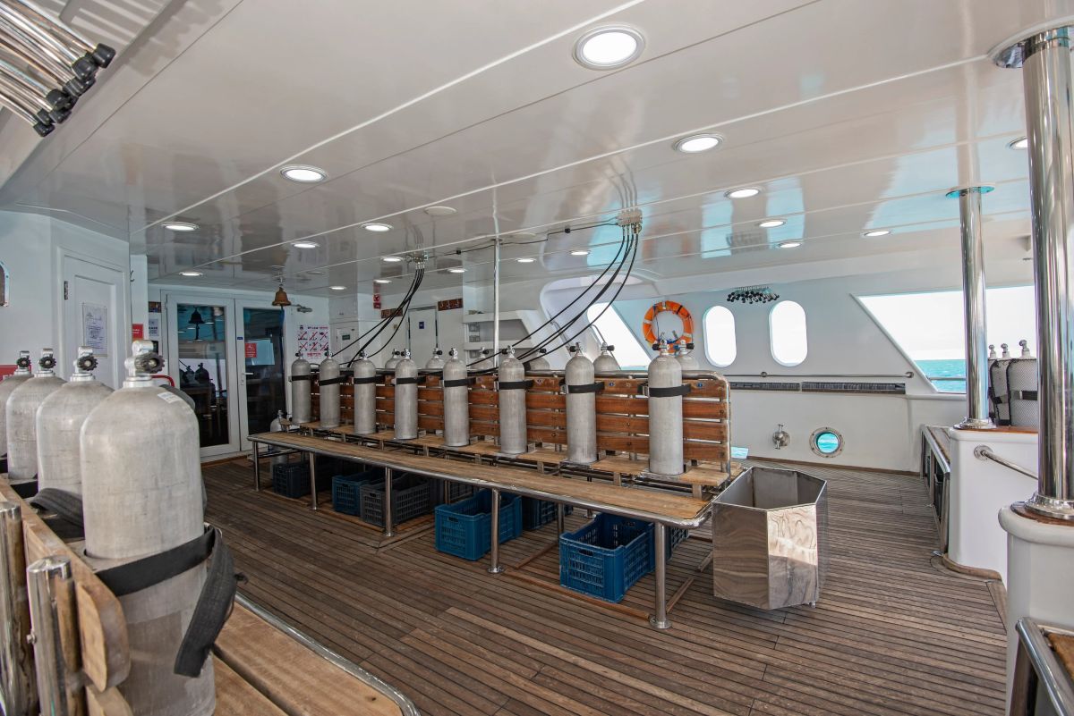 There are two indoor saloon areas. The main saloon and the indoor Sky Lounge are spacious and comfortable, each with a 42” plasma screen TV and entertainment system, air-conditioning and bar facilities. The Sky Lounge has comfy sofas and a bar, and can double as a second teaching area. Blue Horizon has 2 large sundecks and an open-air freshwater jacuzzi, perfect to relax in after a day’s diving.