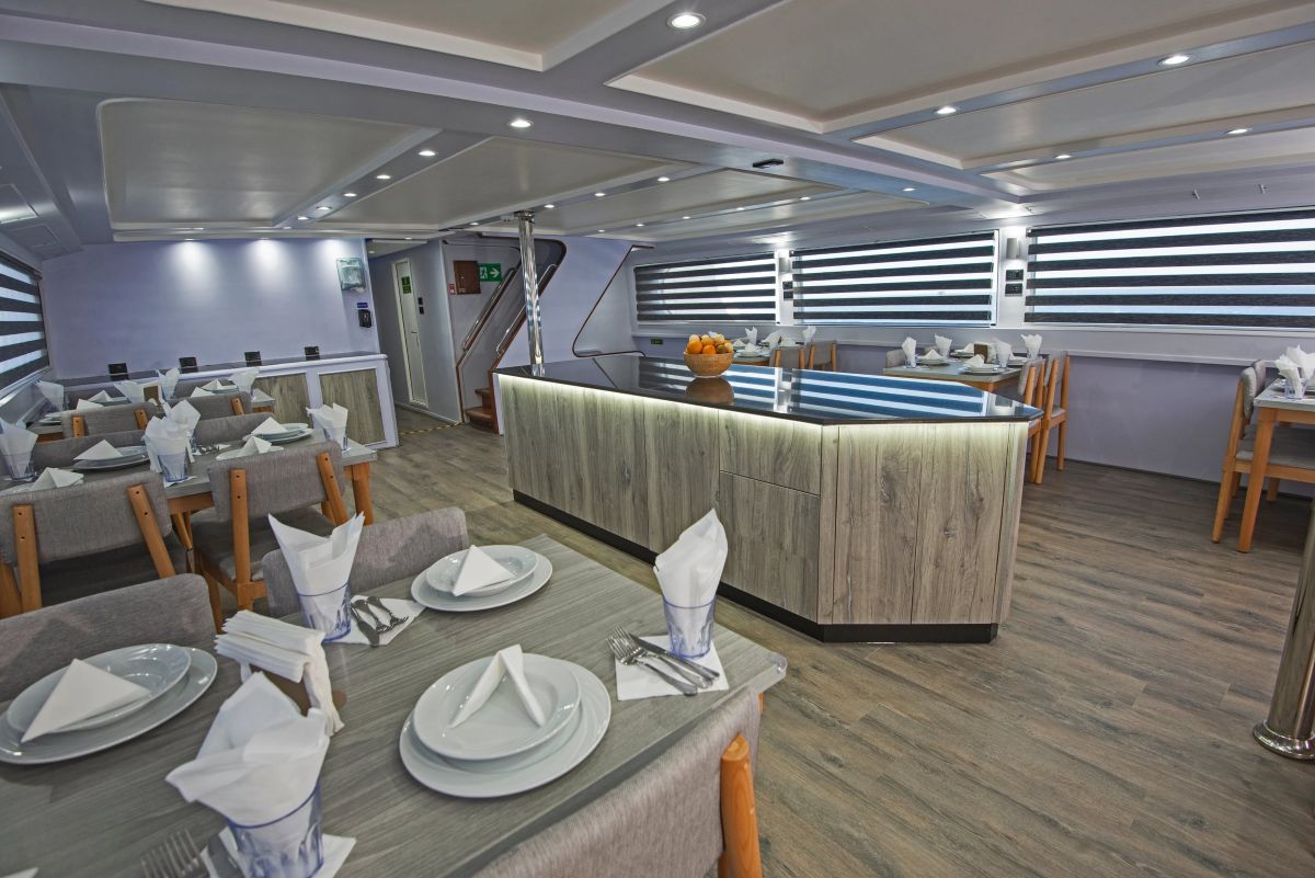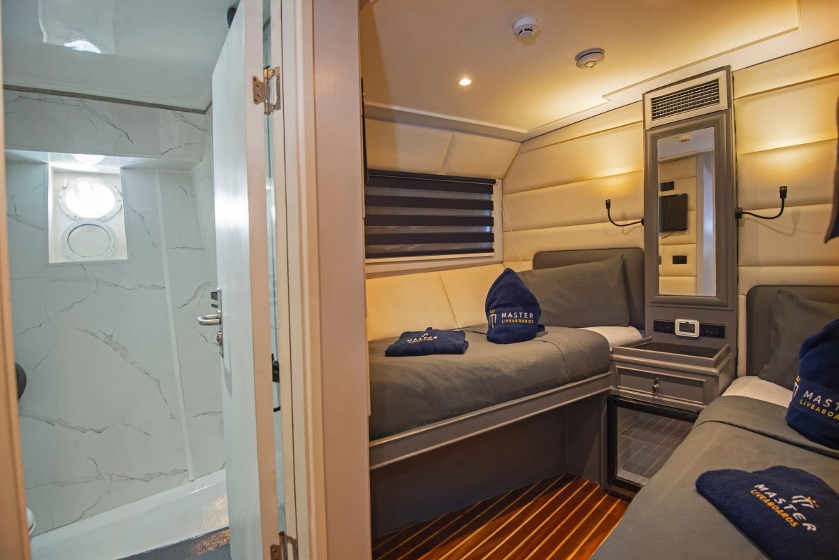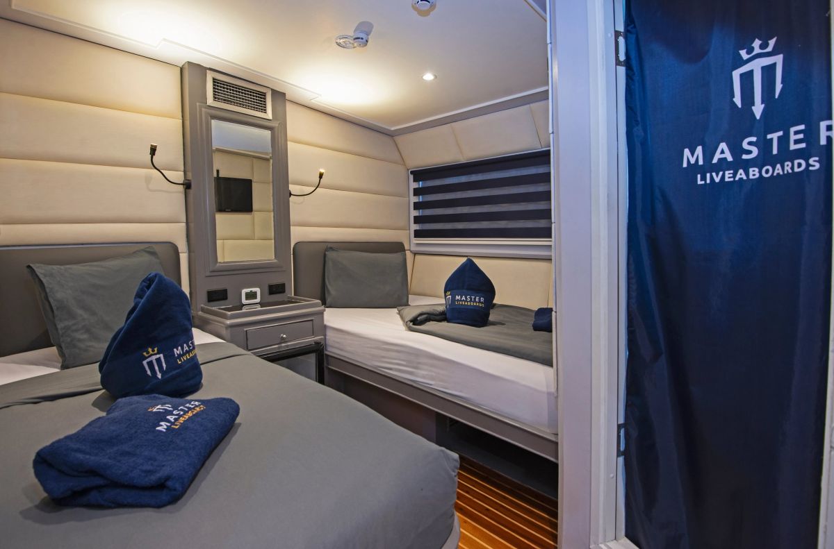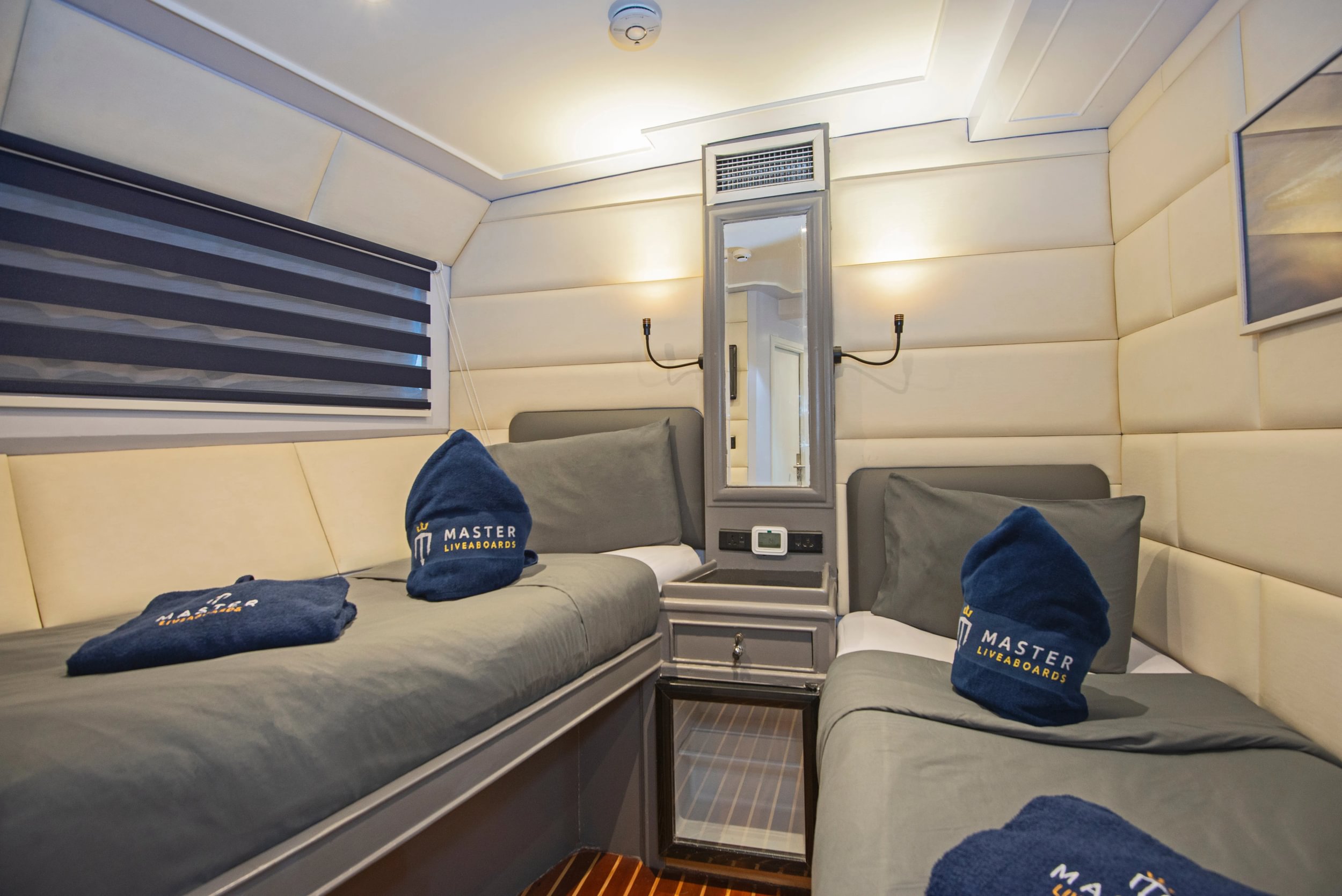 The boat has 4 suites that feature king-size beds (and are suitable for divers with disabilities) and 9 twin rooms. All cabins have air-conditioning and en-suite facilities, a mini bar and personal entertainment system.