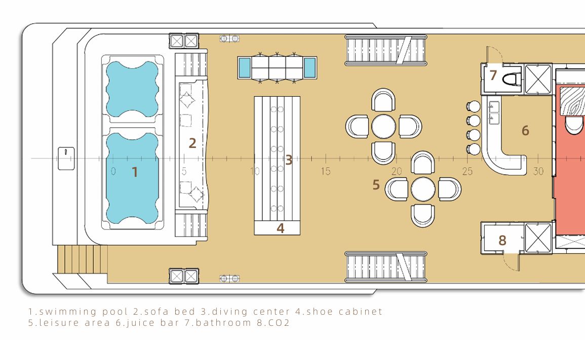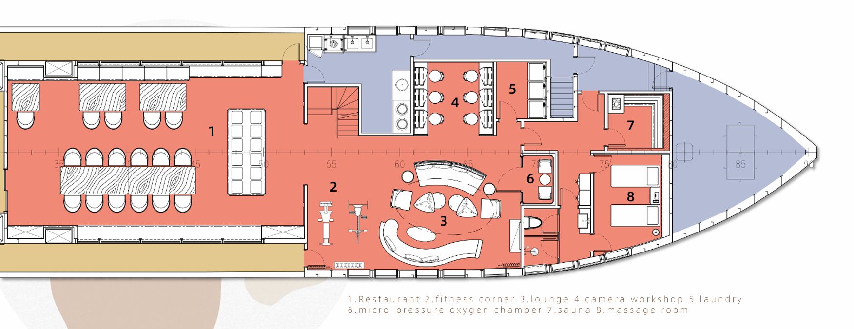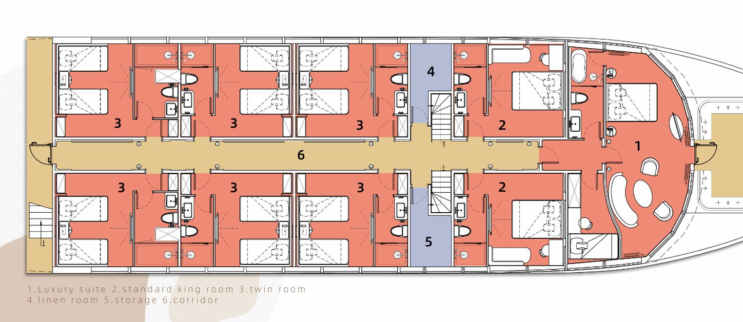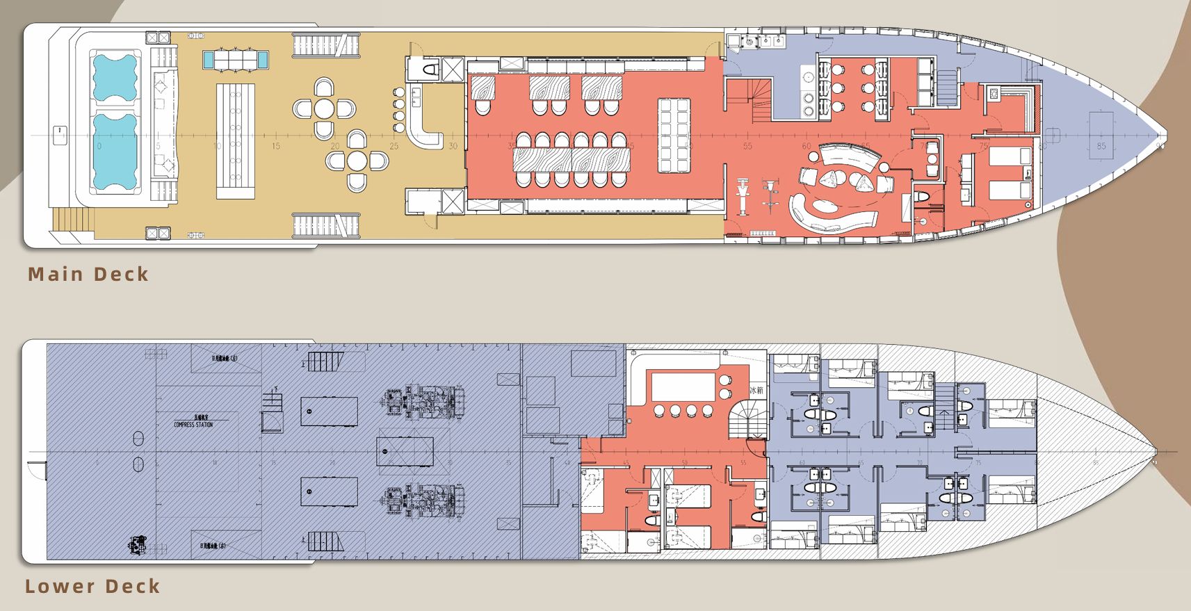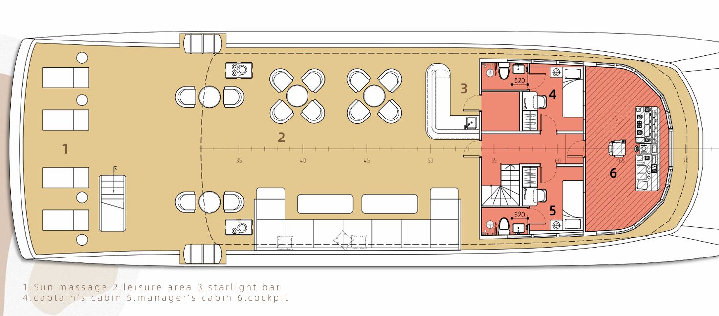 - Premium onboard facilities: pool, lounge, camera room, spa, fitness corner, juice bar, sundeck, etc.