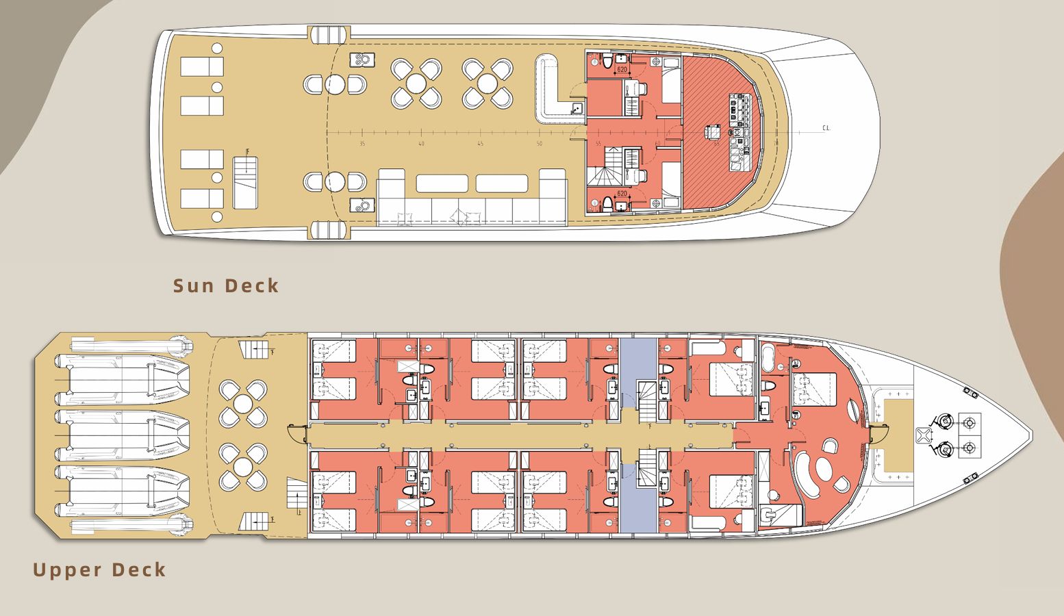 On board, guests can expect spacious cabins with ensuite bathrooms, powerful air-conditioning, and thoughtful storage for dive gear. The communal areas are a real highlight: a generous sun deck, a comfortable lounge and dining area, and plenty of shaded space to relax between dives. The crew are known for their warm hospitality, attention to detail, and the sort of small touches—hot towels after a dive, fresh snacks, camera-friendly workspaces—that instantly make you feel looked after.
