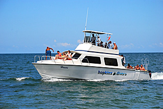 In Southern Belize and directly offshore from Hamanasi is Glover’s Reef Atoll. Named after the 17th century pirate John Glover, who used the remote islands as the base for his raids against Spanish galleons heading to and from the Bay Islands of Honduras, Glover’s Reef probably best represents the incredible diversity and pure diving potential that Belize has to offer. We motor out sixteen miles past the Barrier Reef which takes us just over one hour to the first dive site. If visibility is good we like to dive a site called “The Pinnacles”, which has enormous coral heads rising up 40 ft/12 m or more from the bottom. Our second and third dives are on the east side of the atoll where the water depth quickly drops off to more than 2000ft/660m and visibility is usually over 100 feet.