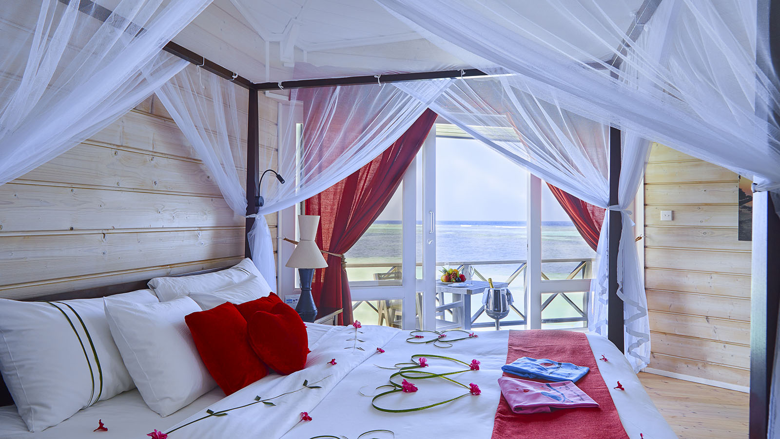 Situated above the crystalline waters of Kuredu, the Sangu Water Villas are an enchanting haven for your romantic retreat. Built on wooden stilts and connected by a walkway, the Sangu Water Villas feature a secluded veranda, perfect for breezy sunbathing and admiring crimson sunsets. The astounding interior together with the beautiful sundeck, perfect for sun and stargazing, provide unrivalled luxury hotel experience. Set nearby the island’s marvellous sandbank, the villas not only enchant with their in-room features, but also with them being entrenched at what is often considered one of the Maldives’ most jaw-dropping stretches of silky sand. Kuredu Resort & Spa draws honeymooners and those after a romantic retreat to its fifty iconic water villas, set in the fanciful ambience of the sunset side of the island. The villas are connected by a wooden boardwalk, at the end of which is Kuredu’s renowned Sangu Water Villa Suite. This ‘Honeymoon Suite’ affords a prime location, offering terrific views of the main beach, the out-of-this-world sandbank and vivid sunsets. The luxury of the Sangu Water Villa Honeymoon Suite is topped off with an outdoor Jacuzzi bath tub.- Terrace over the ocean