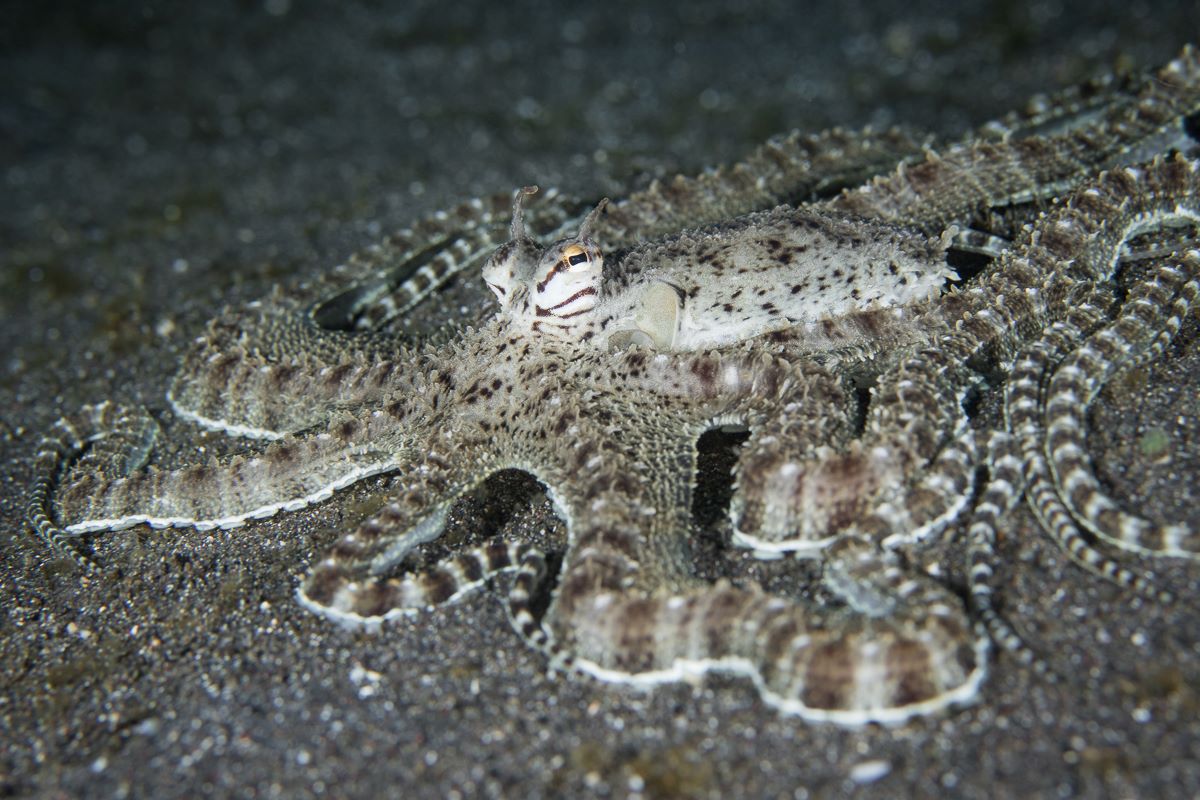Diving in Lembeh reveals an astonishing array of macro life: rhinopias, hairy frogfish, coconut octopus, mantis shrimp, and countless species of nudibranchs. Night dives often produce even more surprises, with hunting cuttlefish, stargazers, and crustaceans emerging from the sand.