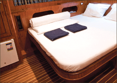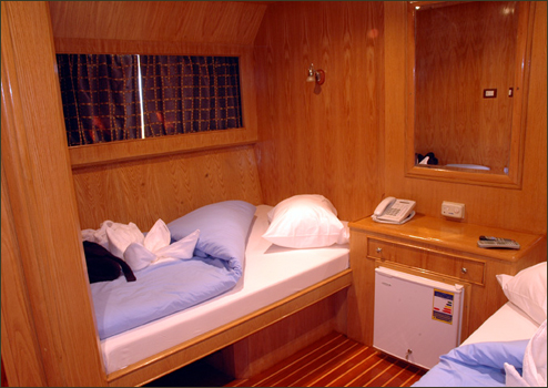 The boat has 4 suites that feature king-size beds (and are suitable for divers with disabilities) and 9 twin rooms. All cabins have air-conditioning and en-suite facilities, a mini bar and personal entertainment system.