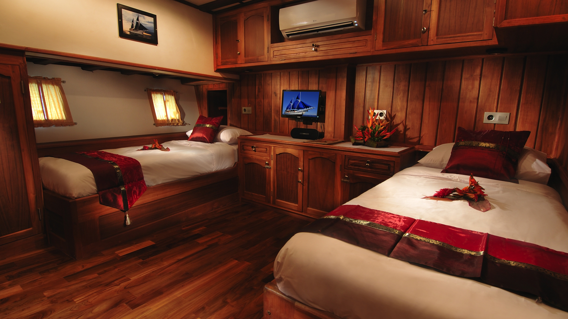Crafted from ironwood and teak, the 40m Philippine Siren liveaboard is a unique gem in the Philippines’ waters. Accommodating 16 guests across eight cabins – two doubles, four twins, and two flexible doubles/twins. Each cabin features individual air-conditioning, ample storage, and private ensuites.